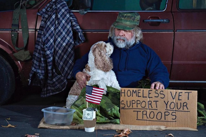 洛杉矶街头,寒风凛冽。他裹着垃圾堆里捡来的破夹克,举着“Hungry”的纸牌乞讨。墨镜遮不住的,是那张被生活碾碎的脸。