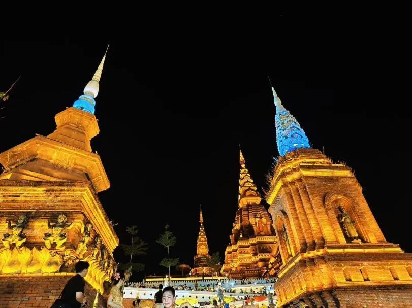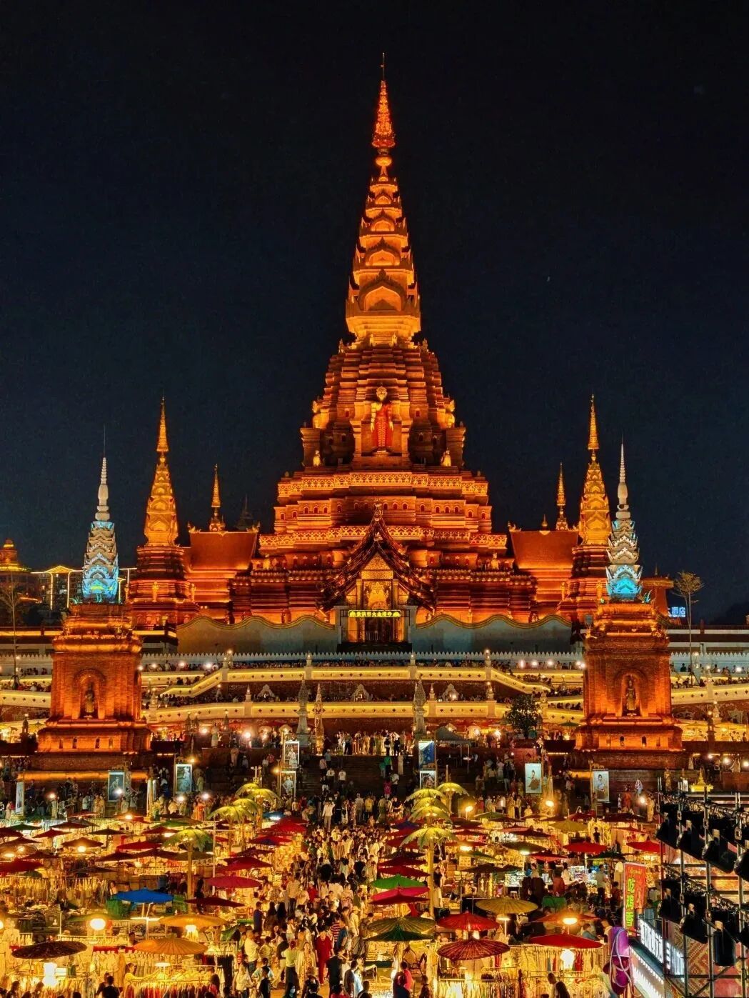 当夜幕降临,数千个摊位同时亮起暖黄色的灯光,与远处大金塔的辉煌交相辉映,仿佛真的把天上的银河搬到了澜沧江边。