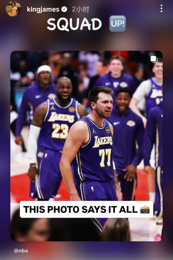 第二个动态是詹姆斯盛赞球队化学反应。转发的是NBA官方社媒的图片,原文“这张图说明了一切”,传递出湖人双核带队、全队士气高涨的信号,也呼应了球队7连胜的火热状态。詹姆斯则加上了自己的备注SQUAD UP(集结)。